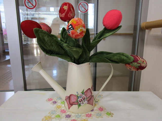 こちらは、ふるさとジョアンの玄関のチューリップのオブジェです。職員さんが季節ごとに、飾ってくれます。