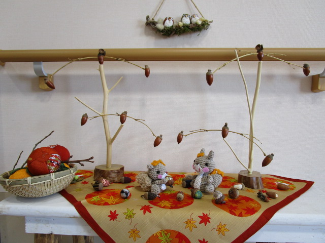 お知らせ(2022年11月その①) 小さい秋見つけた!。<その1> ふるさとジョアンの玄関です。 職員さんが、季節ごとに、飾ってくれます。 りす フクロウ 柿 柿のうしろには、青虫がいます。 ズームしてみました。 どんぐりのやじろべえ(左) どんぐりのやじろべえ(右) どんぐり 全体像 今回も、かわいい!。しかも、凝って(こって)いる!。すばらしいです!。